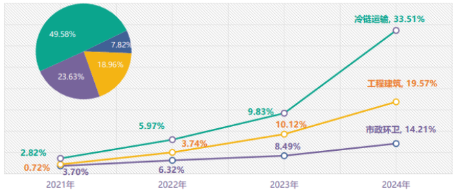 從新能源專用汽車的應用場景分布看,市政環(huán)衛(wèi)、冷鏈運輸、工程建筑構(gòu)成三大主力板塊,合計占據(jù)92.5%市場份額。其中冷鏈運輸領域新能源滲透率達33.51%,居各細分領域之首,這主要得益于生鮮電商爆發(fā)式增長與疫苗等醫(yī)療冷鏈運輸?shù)膭傂孕枨蟆?/span>